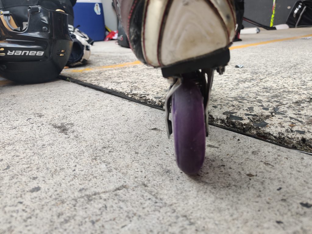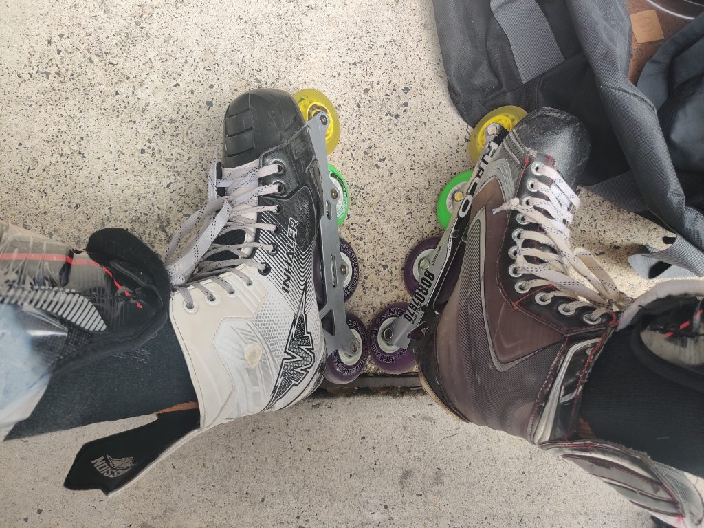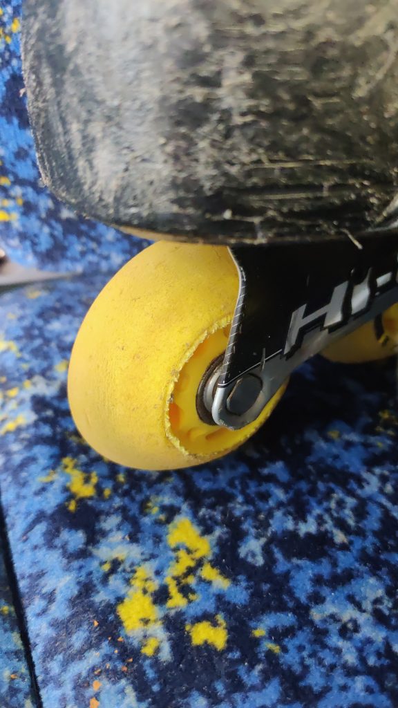 Die ersten beiden Spiel gewinnen wir recht souverän. Im dritten Spiel hatten wir dann einen harten Gegner mit guten Leuten. Da kam es dann leider auch, dass ich ein wenig zu sehr im Hockey-Modus war und dann meinen Torschuss im vollen Lauf noch abgeschlossen habe, leider danach beim Bremsen aber Inline- mit Eishockey verwechselt habe und entsprechend mit beiden Füßen quergestellt in die Bande gekracht bin. Körperlich war alles okay, aber beim Aufstehen musste ich feststellen, dass mein Inliner die Nummer nicht so gut überstanden hatte: