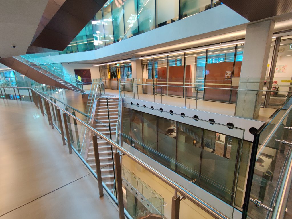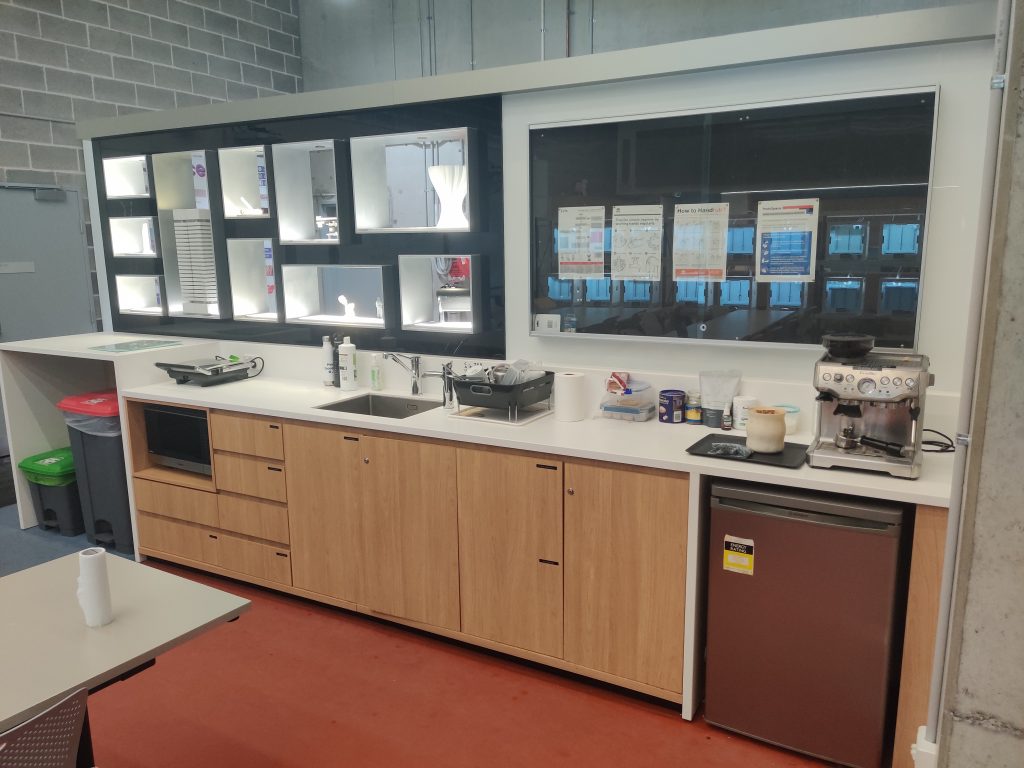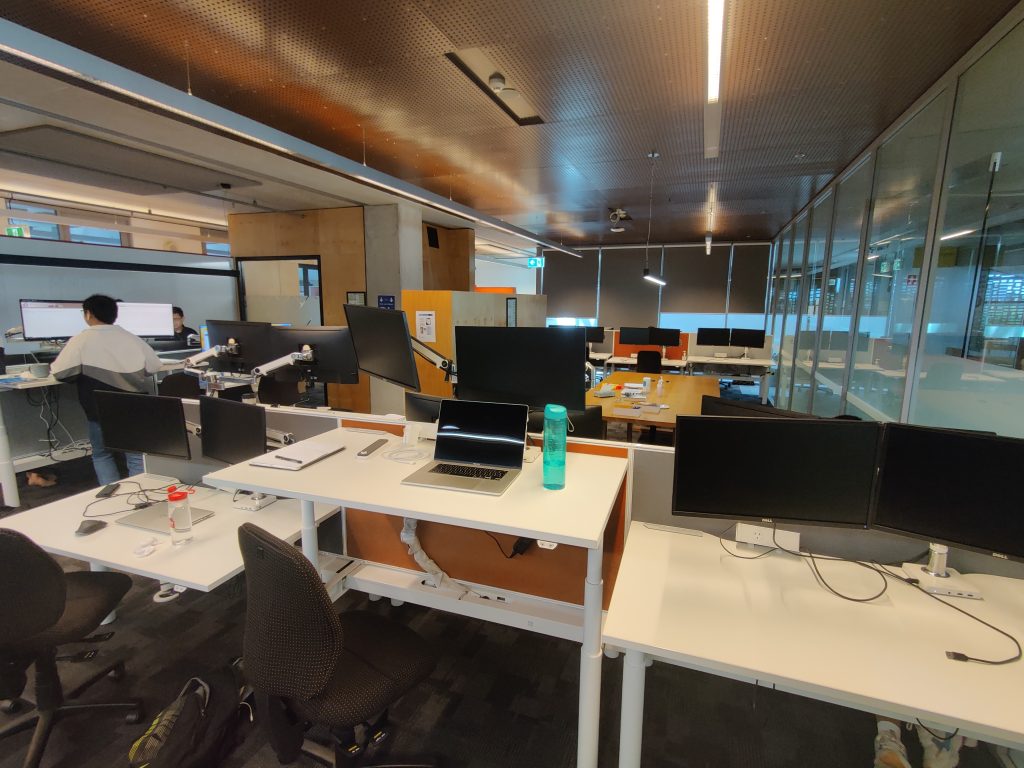 Holy Moly, so aufgeregt war ich schon lange nicht mehr. Ne, Spaß. Genau genommen war ich seit 3 Tagen nicht mehr so aufgeregt. Mit der Managerin des Instituts habe ich mich für ein Onboarding „vormittags“ verabredet. Also bin ich um 8:30 im Hotel aus der Tür gefallen, habe auf dem Weg zur Uni noch kurz Rast am Hundespielplatz gemacht, mich zusammen mit Franzi am Telefon emotional vorbereitet und bin dann in den 9. Stock des Gebäude 11 der UTS gefahren. Das ist auf dem Foto des letzten Beitrags ganz links. Der Kasten, der nachts grün leuchtet. Vor Ort habe ich erstmal festgestellt, dass ich nichts feststelle. Da waren eine Menge verglaster, leerer Büros. Und auch meine Managerin „Robyn“ war nirgends zu finden. Zum Glück hatte sie mir aber in weiser Voraussicht ihre Handynummer gegeben, so dass wir uns dann doch noch gefunden haben. Dann gab es eine sehr kurze Führung durch das Stockwerk und direkt in ein anderes Gebäude zum Security-Check-In. Mit einer einer Zugangskarte ausgestattet war ich dann gegen Mittag wieder im Institut. Da füllte sich zumindest das Großraumbüro langsam. Während ich auf Robyn wartete, habe ich mich den Anwesenden einfach einem nach dem anderen vorgestellt. Unter anderem auch einem Typen, der auf dem Gang saß und sich gemütlich Donuts einverleibte. Mit vollem Mund erklärte er mir auf Englisch, dass er „Bury“ hieße und auch zu Forschungszwecken da sei. Ich habe mir dann mit meinem Wackelenglisch einen abgebrochen, ihm zu erklären wer ich bin und dass ich an meinem Englisch noch arbeiten müsse und bin weiter. Im Großraumbüro habe ich dann Christopher kennengelernt. Kurzer Hint: der Typ ist einer der witzigsten Menschen, die ich überhaupt in meinem Leben kennenlernen durfte. Leider aber zwischenzeitlich schon wieder abgereist. Sei es drum. Ihn hatte ich jedenfalls gebeten, mir eine ausführlichere Führung zu geben und mich dann auch in dem Zuge den ganzen Nasen einmal vorzustellen. Wir sind dann also wieder zurück über den Flur und da saß immer noch Bury. Zu dem verlor Christopher dann nur den Kommentar „ach, hier, das ist Boris, der andere Deutsche.“ Leicht verdattert brachte ich dann nur raus „sag das doch, ey“ – und er antwortete recht lässig, dass ich doch Englisch lernen wolle und er nur helfen wollte. Zu meiner Verteidigung muss ich allerdings hier sagen, dass Boris aka. Bury schon die halbe Welt bereist hat und komplett akzentfrei Englisch spricht. Nachdem ich dann auch die anderen Nasen vor Ort kennengelernt hatte, gab es eine kleine Einführung in die Arbeitsplätze im Großraumbüro und dann wurde ich in die Stillarbeit entlassen. Das sieht dort so aus: