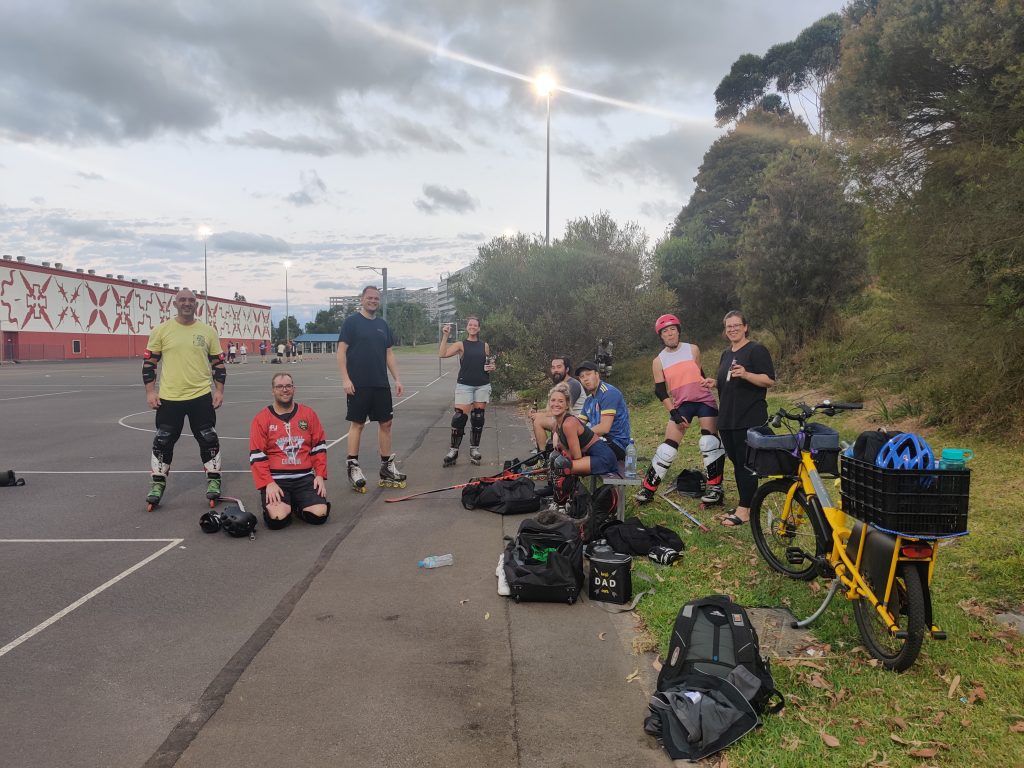 Und wie es der Zufall so wollte, hatten die natürlich ihr nächstes Training genau an dem Dienstag, an dem ich gerade geschaut hatte. Also so ca. 3h später. Ich hatte dann noch versucht jemanden von denen über Facebook zu erreichen, bekam aber erstmal keine Antwort. Bin dann völlig verjetlagt zurück ins Hotel, habe mich aufs Bett gelegt und überlegt, ob ich einfach einschlafen soll. Aber weil ich die Zeit hier nutzen will und weil der Zufall es nunmal so wollte, dass ich dieses Training sehe, habe ich mir meine Skates geschnappt, mich in die Bahn geschwungen und bin zum Hockey Drop-In gefahren. Die letzten 2 km zur Spielfläche sind a) lang und b) bescheiden betoniert. Das war eigentlich schon das erste Abenteuer dort. Bin aber dann doch heil angekommen, habe die Leute auf einem Basketballplatz spielen sehen und bin einfach hingerollt. Ich war sicherlich noch 30m entfernt, als mir der einzige Auswechselspieler entgegenbrüllte: „Mate, where’s your stick?!“ („Kollege, wo ist dein Schläger?!“). Habe ihm dann meine Situation erklärt und ca. 20 Sekunden später hatte ich seinen Schläger in der Hand und habe Hockey gespielt. In Sydney, bei 25° C und einer leichten Brise. Dazu Musik. Da war ich dann schon etwas im Hockeyhimmel. Am Ende stellte sich dann heraus, dass dort auch eine Deutsche dabei war und der Rest wirklich quer aus der Welt zusammengewürfelt ist. Aber eben alles Leutchen, die schon lange in Sydney leben. Hier ein paar Eindrücke: