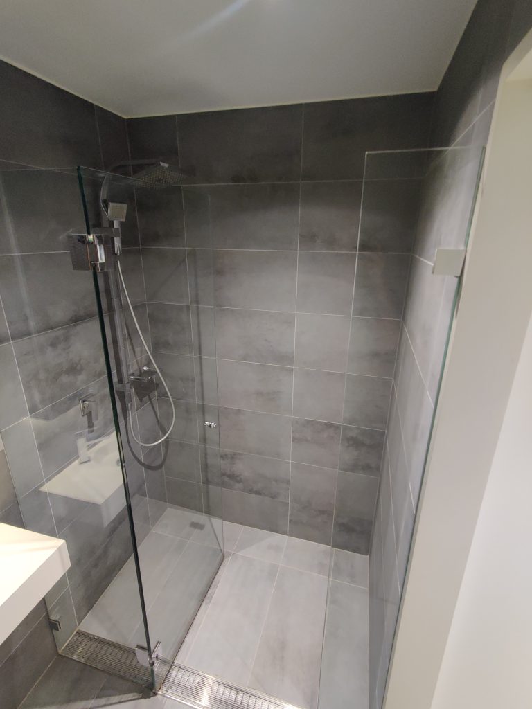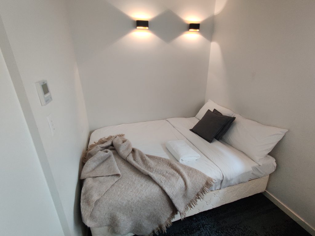 Auf dem letzten Bild sieht man ganz gut die Aufteilung. Der Raum ist leider so eng, dass man kein besseres Foto machen kann. Man kommt also rechts rein, steht dann in der Küche. Daneben der Schreibtisch und gegenüber dann das Bett. Quasi hinter mir ist dann das Bad.