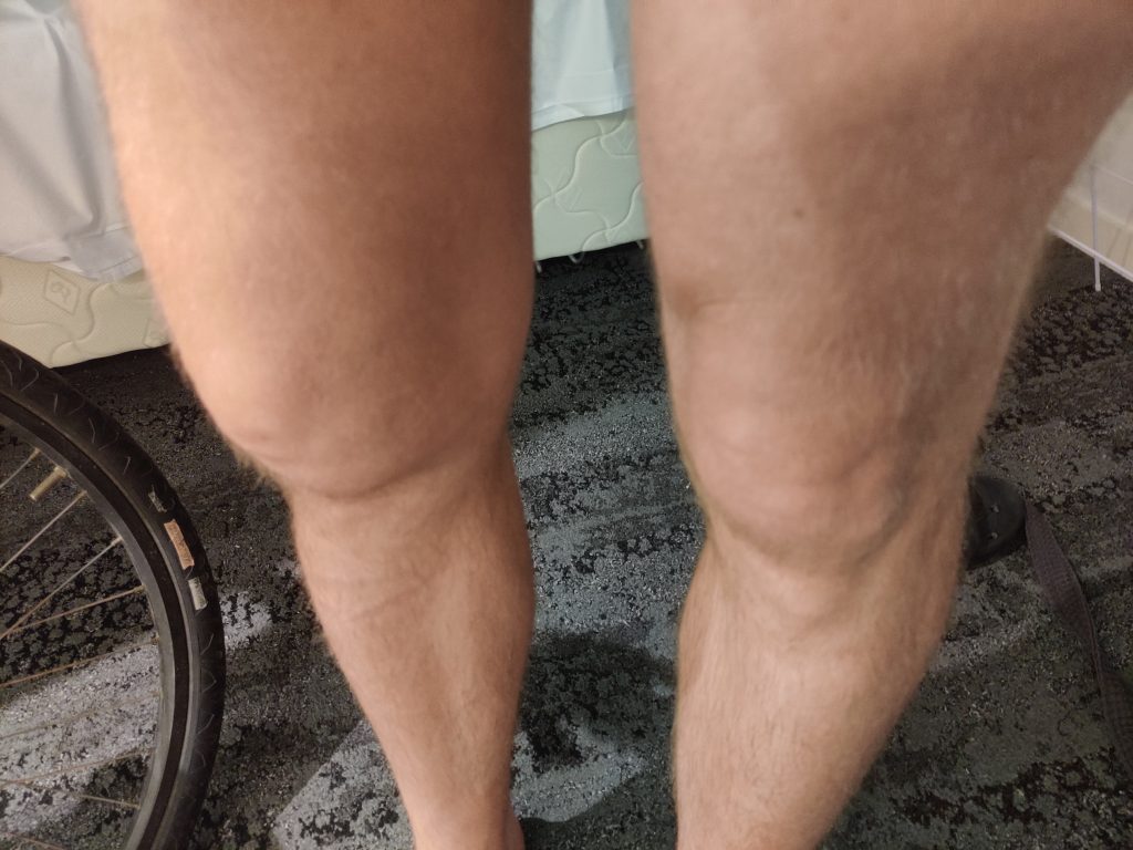 Das Halbfinale haben wir dann recht deutlich verloren (eine kleine Story zu dem Spiel bezüglich einer Meinungsverschiedenheit gibt es auch noch, aber die erzähle ich mal persönlich). Bei mir ging nach dem Spiel dann aber auch nicht mehr viel. Leider hatte sich mein Knie nach zwei Tagen Vollgas Hockey dann doch recht deutlich zurückgemeldet. Auf dem Foto hier kann man es ganz gut sehen. Mein rechtes Knie war einfach so voll mit Wasser, dass man den Übergang zum Oberschenkel gar nicht mehr gesehen hat:
