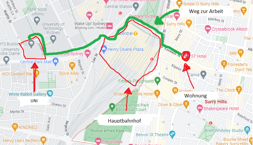 Montag, 11 Uhr, ich stehe mit Koffer, zwei Tüten, Eishockeyschläger und meinem Rucksack vor dem Hotel Hacienda. Für den Umzug gönne ich mir den Luxus eines Ubers. Das sind quasi Privatleute, die Taxifahrten in ihren privaten Fahrzeugen anbieten. Der Preis ist fix pro Fahrt, die Fahrer in etwa so unfreundlich wie die meisten deutschen Taxifahrer. In Deutschland kämpft Uber soweit ich weiß immer noch mit den Behörden. Das Taximonopol scheint uns Deutschen irgendwie heilig. Aber sei es drum. Wir fahren vom Stadtteil Chippendale ca. 10 Minuten in meine neue Heimat: Surry Hills. Surry Hills liegt östlich vom Hauptbahnhof und der Uni. Ich packe hier mal eine kleine Karte in den Post: