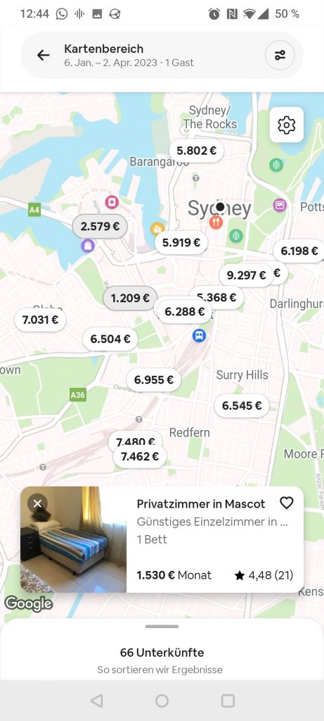 Den ersten Tag bei der Arbeit hatte ich jedenfalls hinter mich gebracht. Ich war recht lange im Büro und bin entsprechend erst ca. 22 Uhr zurück im Hotel gewesen. Kurzes Telefonat mit der Heimat und ab in die Falle. Am Dienstag habe ich dann neben diversen Kennenlern-Gesprächen vor allem ein Thema beackert – die Wohnungssuche in Sydney. Und wahrscheinlich muss ich dazu sogar eigentlich noch einen extra Eintrag machen. Kurz: es ist unfassbar schwer, hier eine Wohnung/Zimmer für nur 3 Monate zu finden. Aber wir wollen weiter chronologisch vorgehen.