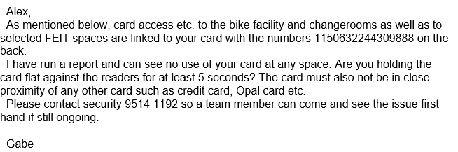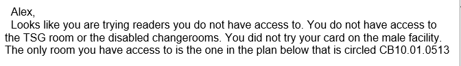 Oder hier, die Mail war auch klasse. Die hat er mir geschickt, nachdem sein Kollege meine Karte an ein paar Räumen versucht hatte, um herauszufinden, ob sie überhaupt funktioniert:
