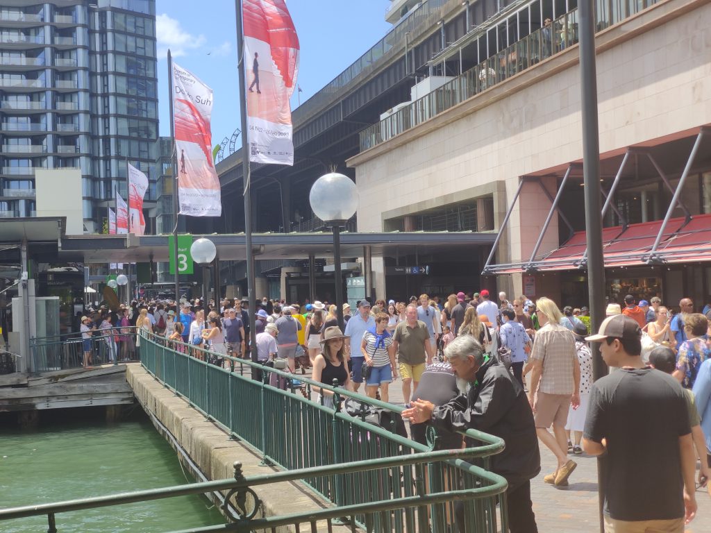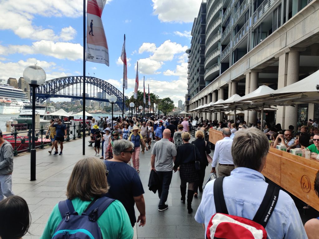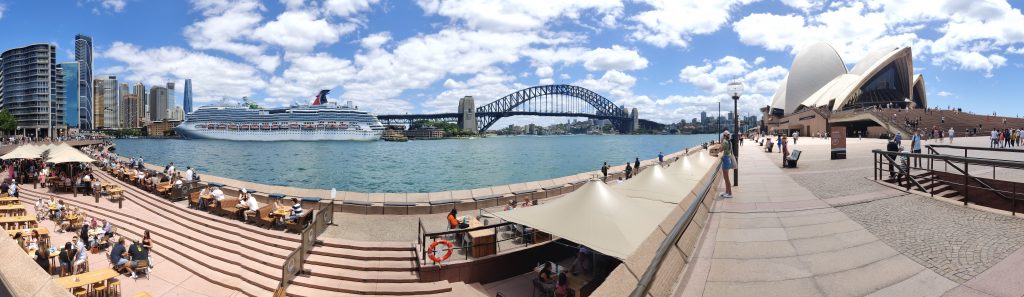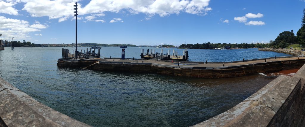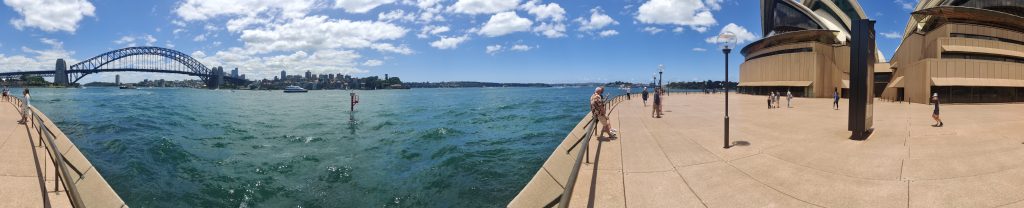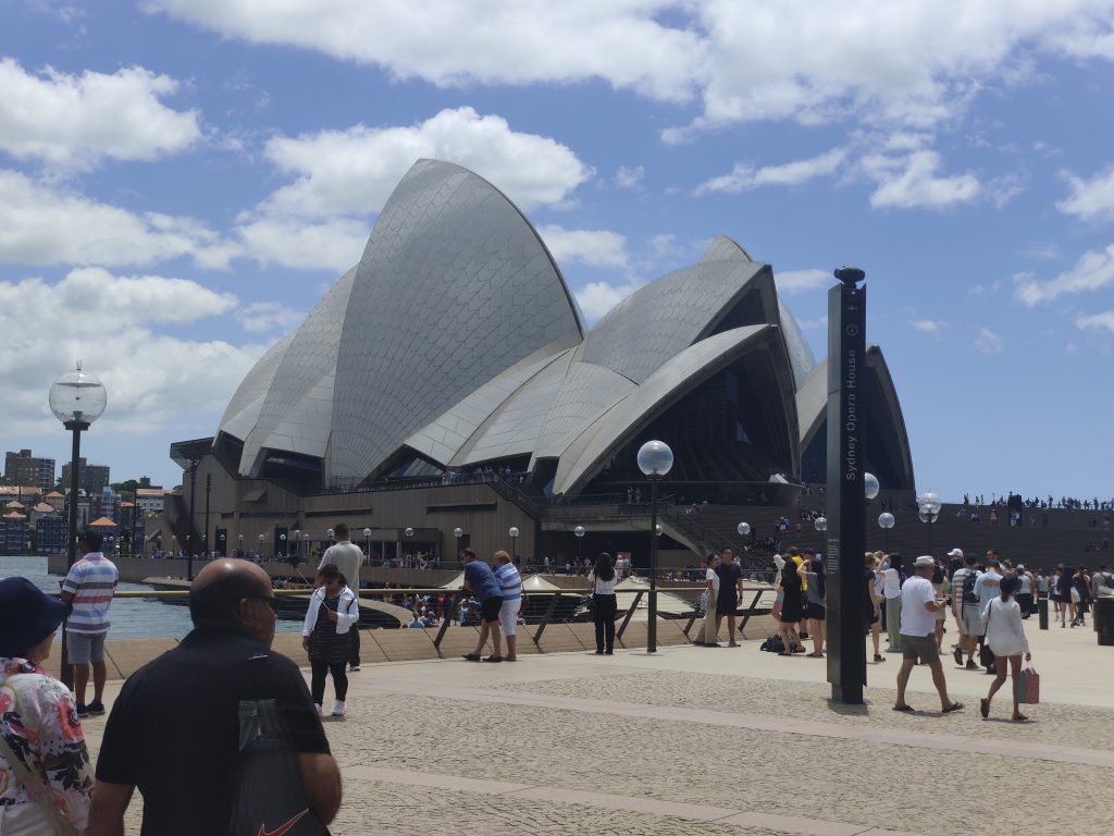 Sonntag bin ich deutlich früher aus den Federn gekommen. Zwischenzeitlich hatte ich dann auch festgestellt, dass die Aussies digitalisierungsmäßig deutlich weiter sind als wir Deutschen. Man kann an den Bahnhöfen und allen anderen Öffis nicht nur mit der speziellen Opal-Card bezahlen, sondern auch einfach jede beliebige Kreditkarte nehmen. Sogar das Rabattsystem wird auf die Kreditkarte genauso angewandt wie auf die Opal-Card. Entsprechend bin ich dann nach Redfern zum nächsten Bahnhof (ca. 10min Laufen) und von dort aus mit dem Zug zum Circular Quay (ausgesprochen Zirkular Ki). Ich nenne übrigens die ganzen Stationen, falls jemand (aka. Mutti) gerne nebenbei auf der Karte gucken möchte, wo ich so war. Dort angekommen hat sich mir ein anderes Sydney offenbart. Vom Quay aus läuft man nämlich so ca. 15min zum Opera House – dem Touri-Hotspot schlechthin. Entsperchend sah es dort so aus: