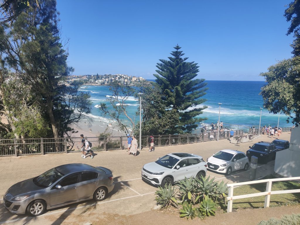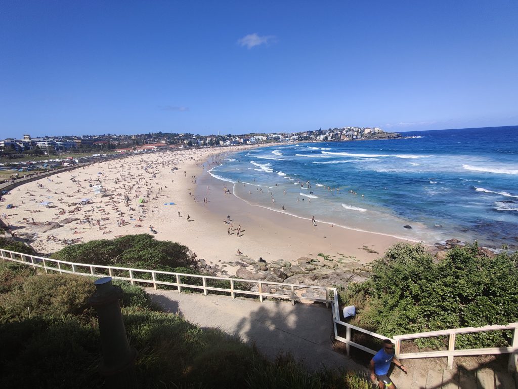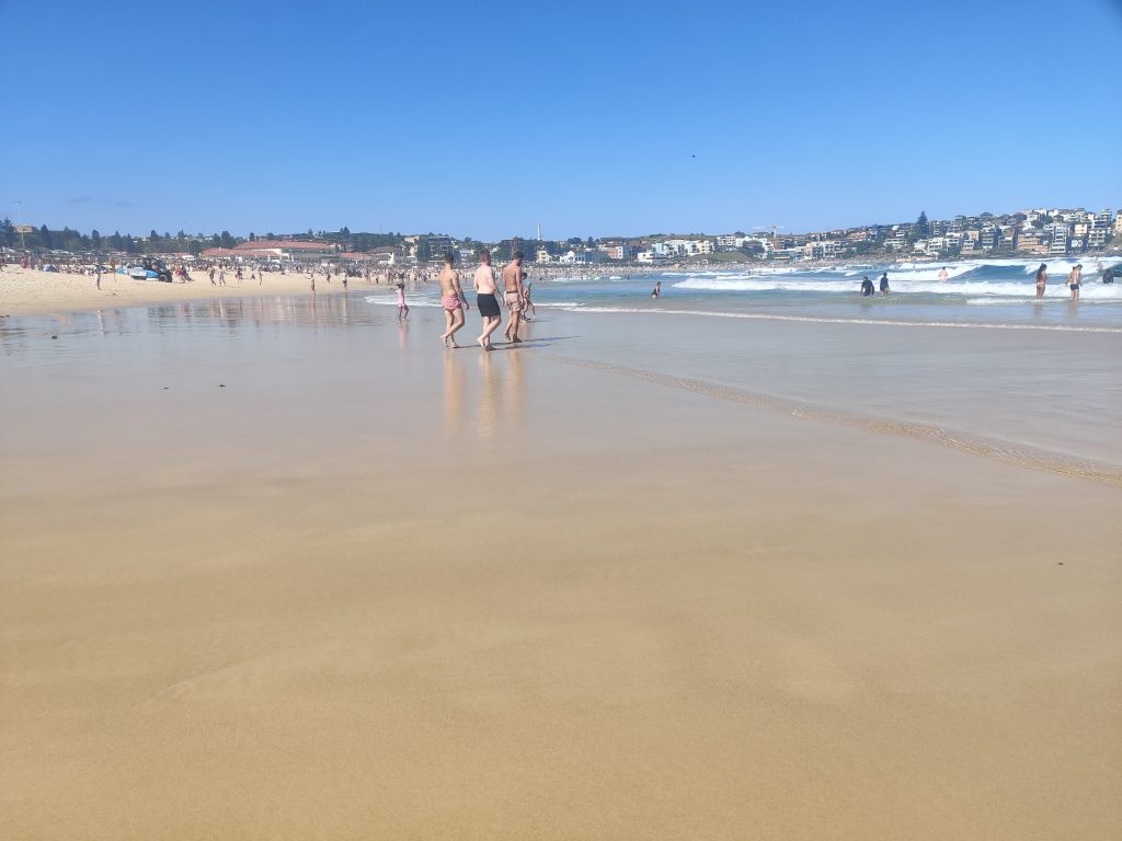 Nun kam ich also gegen 14 Uhr aus dem Opernhaus gewackelt und dachte mir: ist noch ganz schön viel Zeit, vielleicht sollte ich noch etwas machen. Also bin ich los und per Bus zum Bondi Beach. Das ist DER Strand hier in Australien. Für Surfer, Touris, Locals und auch sonst jeden, der mal hier ist. Muss man halt gesehen haben. Entsprechend voll und durchmischt sind auch die Busse dort hin. Man braucht vom Stadtkern und Opernhaus gleichermaßen ca. 45min, bis man dort am Strand steht. Da offenbart sich einem dann folgendes Bild: