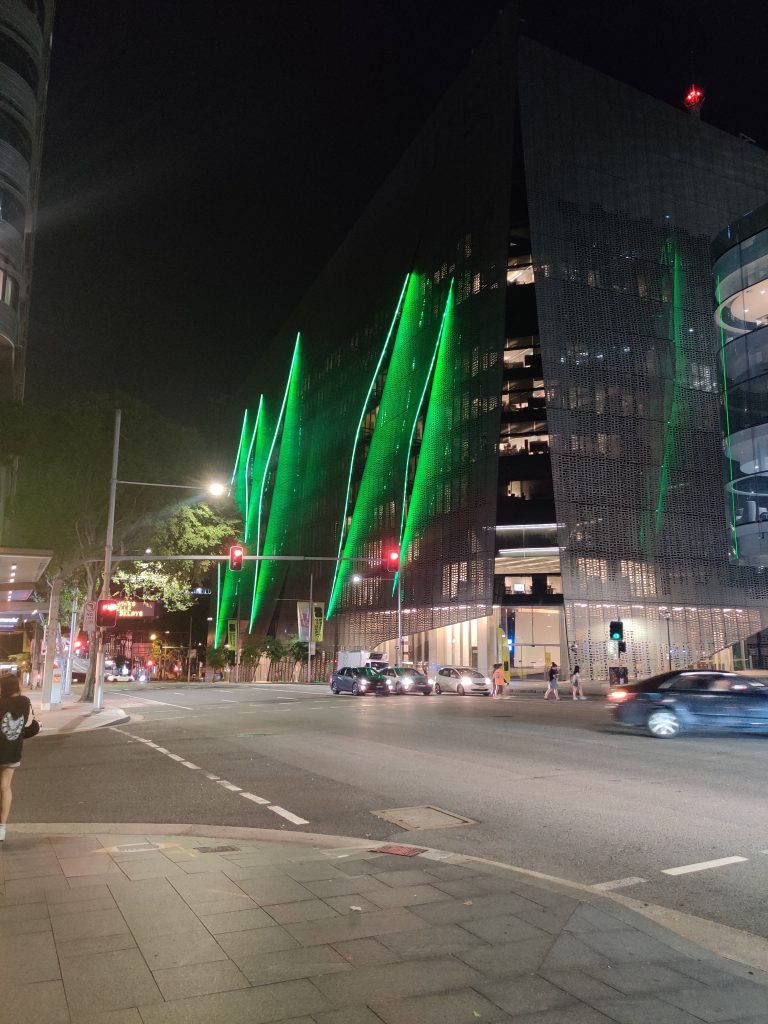 Und wo ich schonmal da war, habe ich brav meine 10$ verzockt, alles angeguckt und bin wieder los. Es scheint in Sydney davon ab für Paare eine völlig normale Beschäftigung zu sein, samstags abends eine Runde ins Casino zu gehen, bevor man ins Kino geht oder essen. Man sieht es auf dem Foto nicht, aber das Ding war so groß wie ein ganzes Einkaufszentrum. Auf dem Weg nach Hause habe ich dann versucht mit der Straßenbahn zu fahren, was aber nicht klappte, weil man eine spezielle Karte braucht und keine Einzeltickets mehr verkauft werden. Da fiel mir dann auf, dass ich doch schon recht weit gelaufen war. Bin dann wieder zurück, direkt wieder in die Falle und muss so um 0 Uhr eingepennt sein. Auf dem Weg nach Hause bin ich nochmal am Unigebäude vorbegekommen. Das sieht bei Dunkelheit dann so aus: